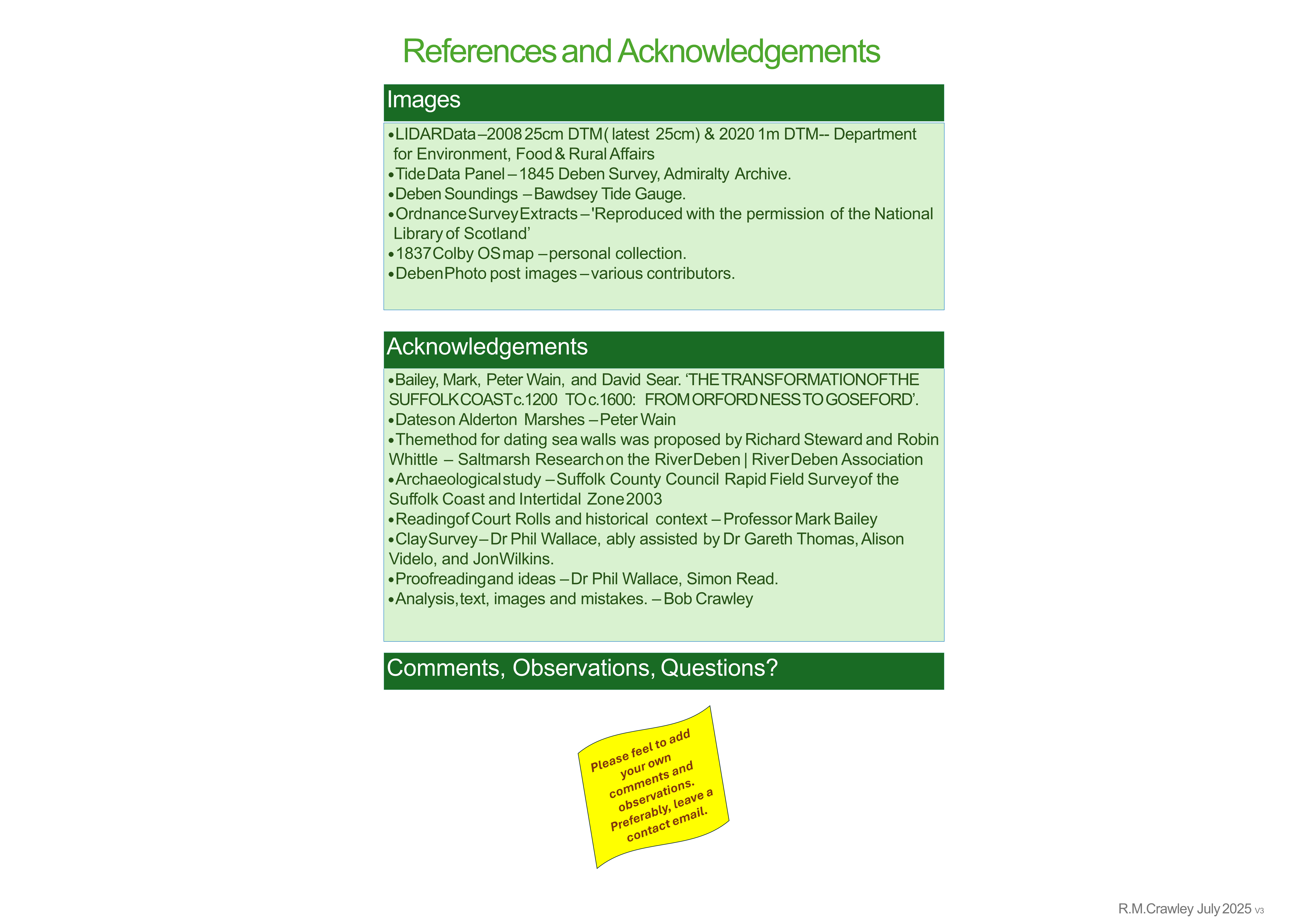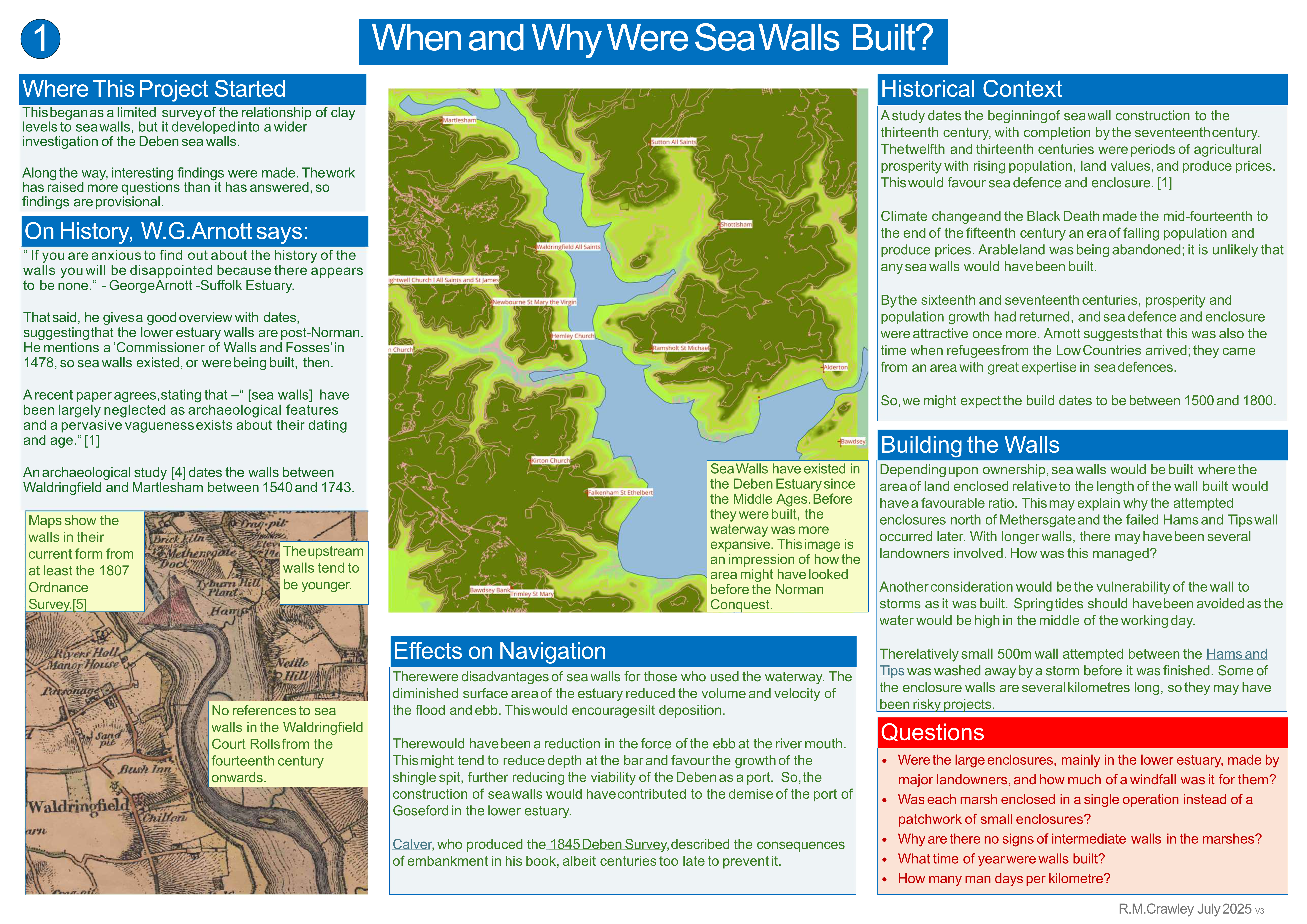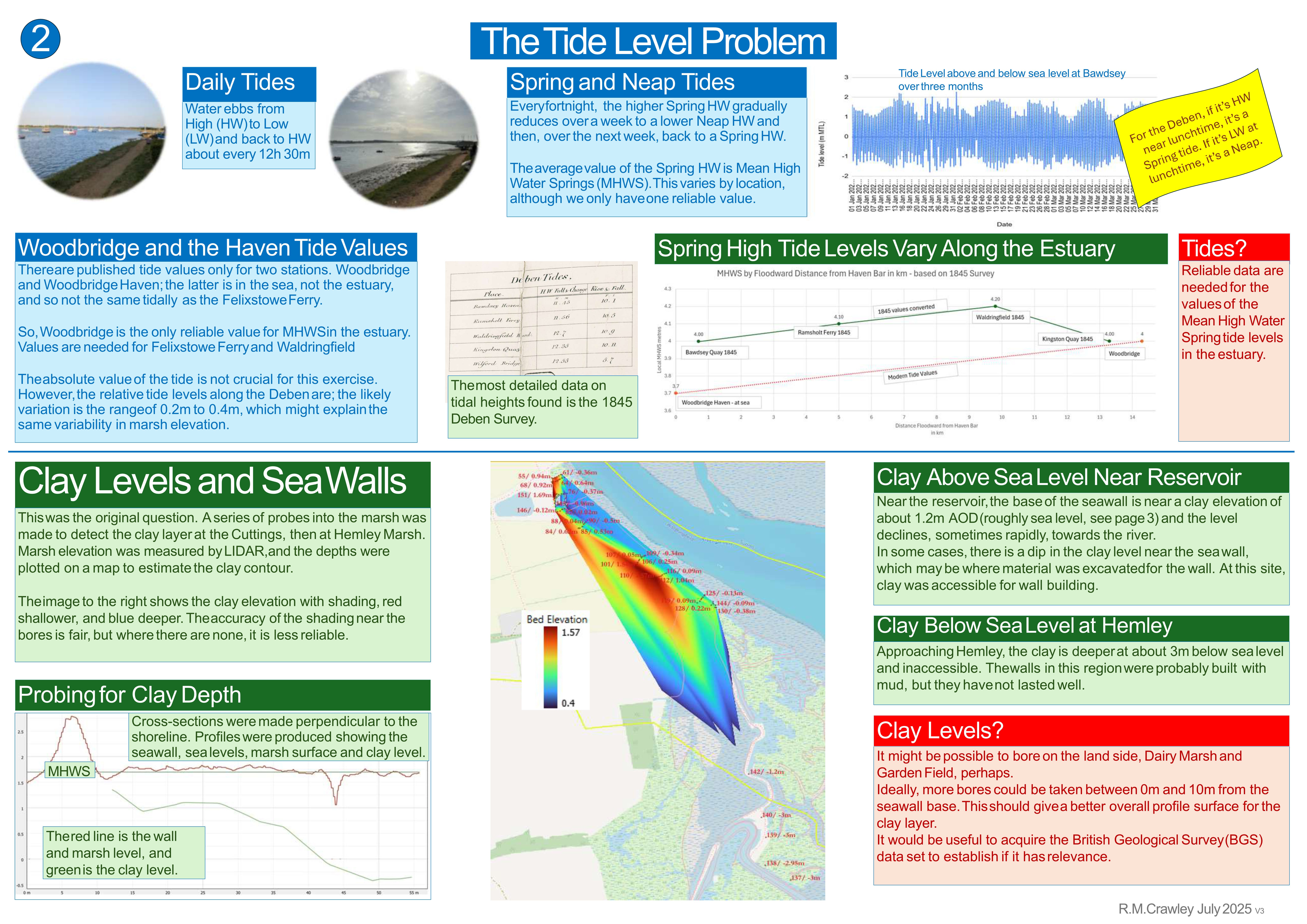 This began in early 2025 as a survey of the relationship of clay levels to sea walls, but developed into a wider investigation of the Deben sea walls. Along the way, interesting findings were made. The work has raised more questions than it has answered, so findings are provisional. The results were presented as a slide presentation below or as set of posters for an exhibition held in August 2025, attached <here>.