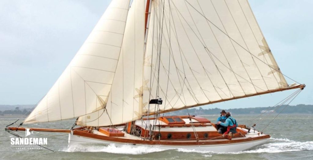 - 30′ length, 9′ beam, 4’3″ draught. Auxiliary gaff cutter with topsail.