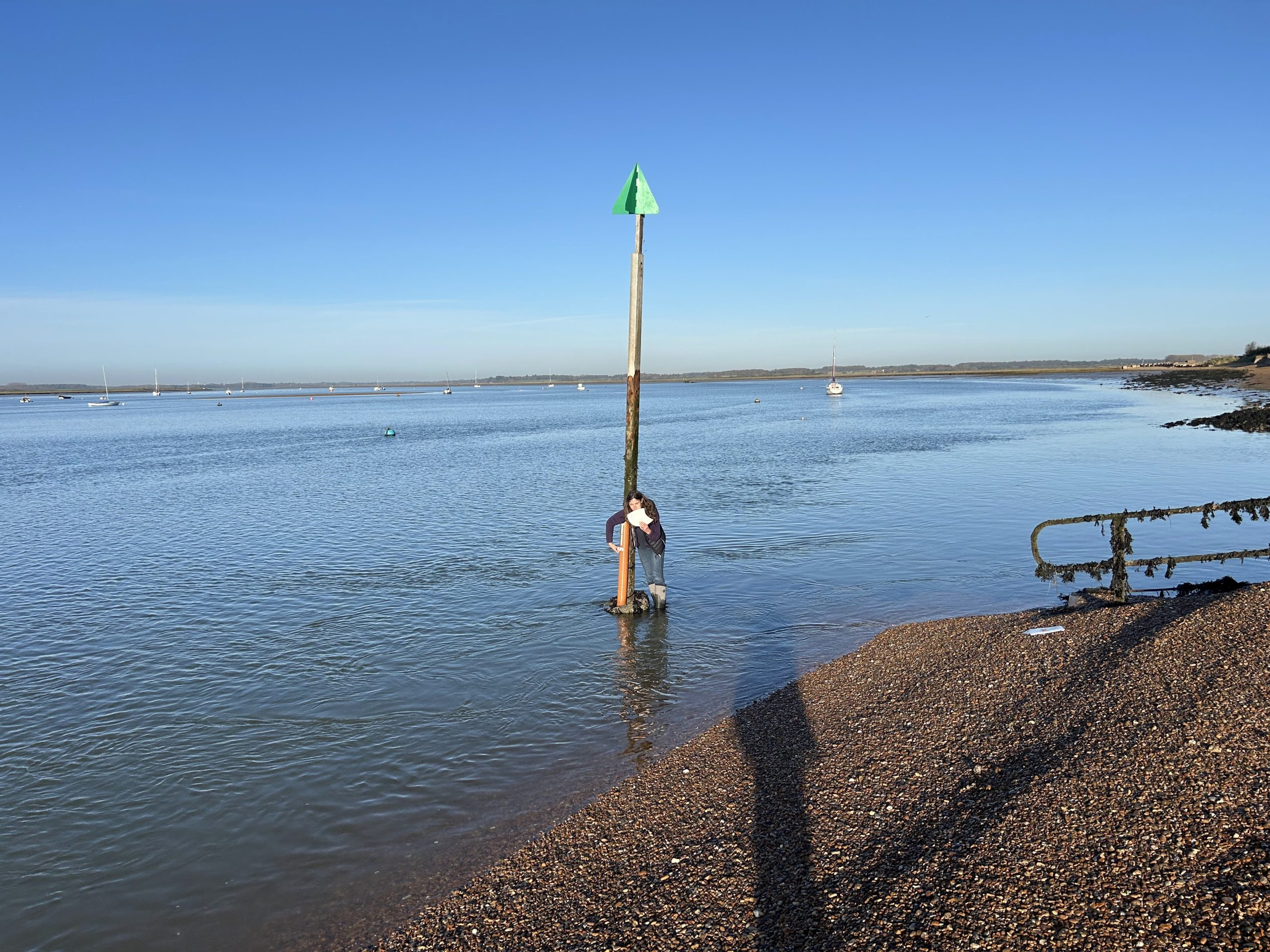 In Prof Burningham’s view, the spit (or Bawdsey Point) is really suffering with a general lack of sediment (sand/shingle) supply (albeit the sand eroded from Bawdsey cliffs is at least contributing somewhat). Without intervention, both shorelines (sea and inlet margin) are likely to continue eroding as there isn’t sediment available to supply them. It’s possible that the spit, once there has been a decent period of southerly waves, might bend/recurve into the inlet and provide some sediment supply at measuring point 1 (the seaward end of the iron piling), but it will take some months for this to work along to the quay.