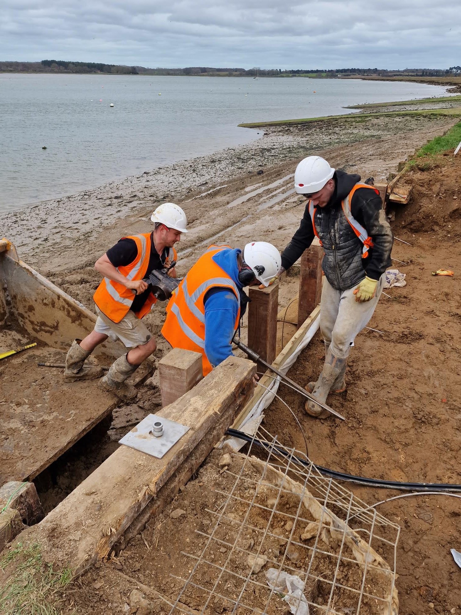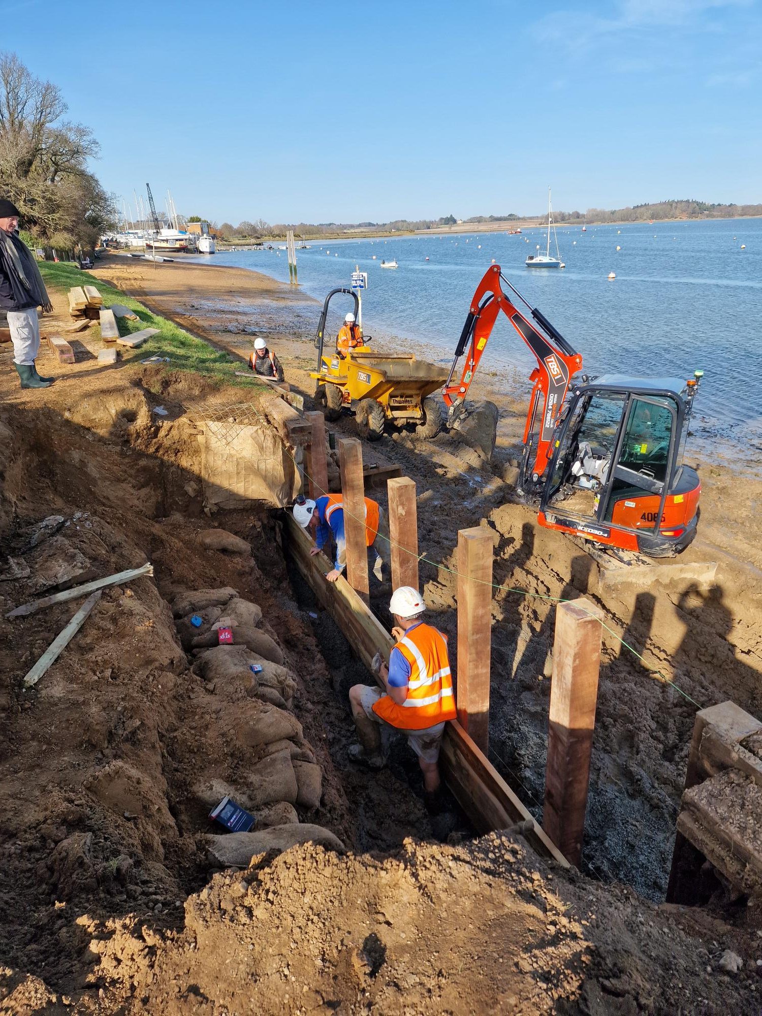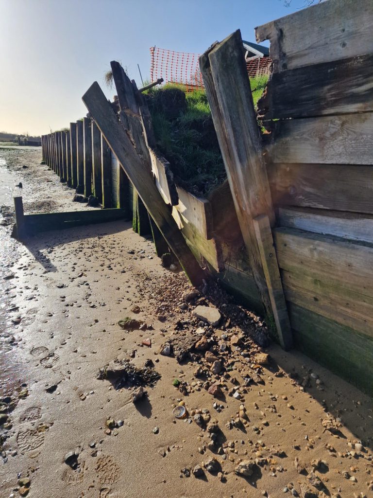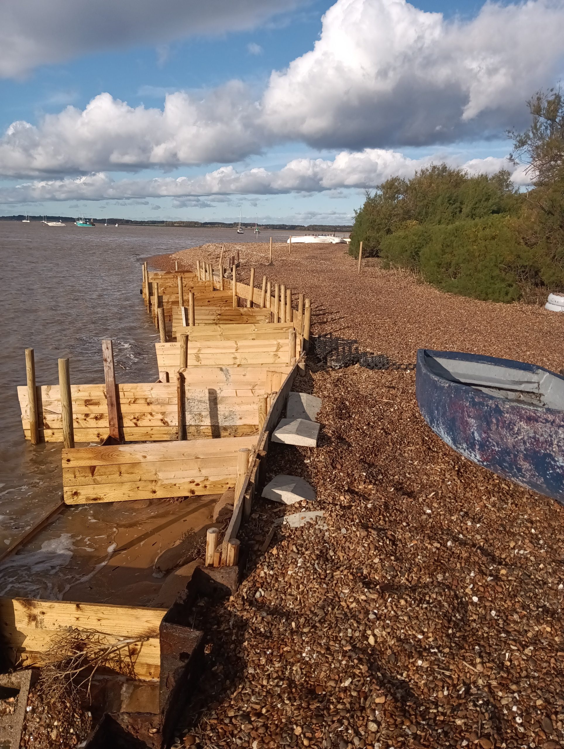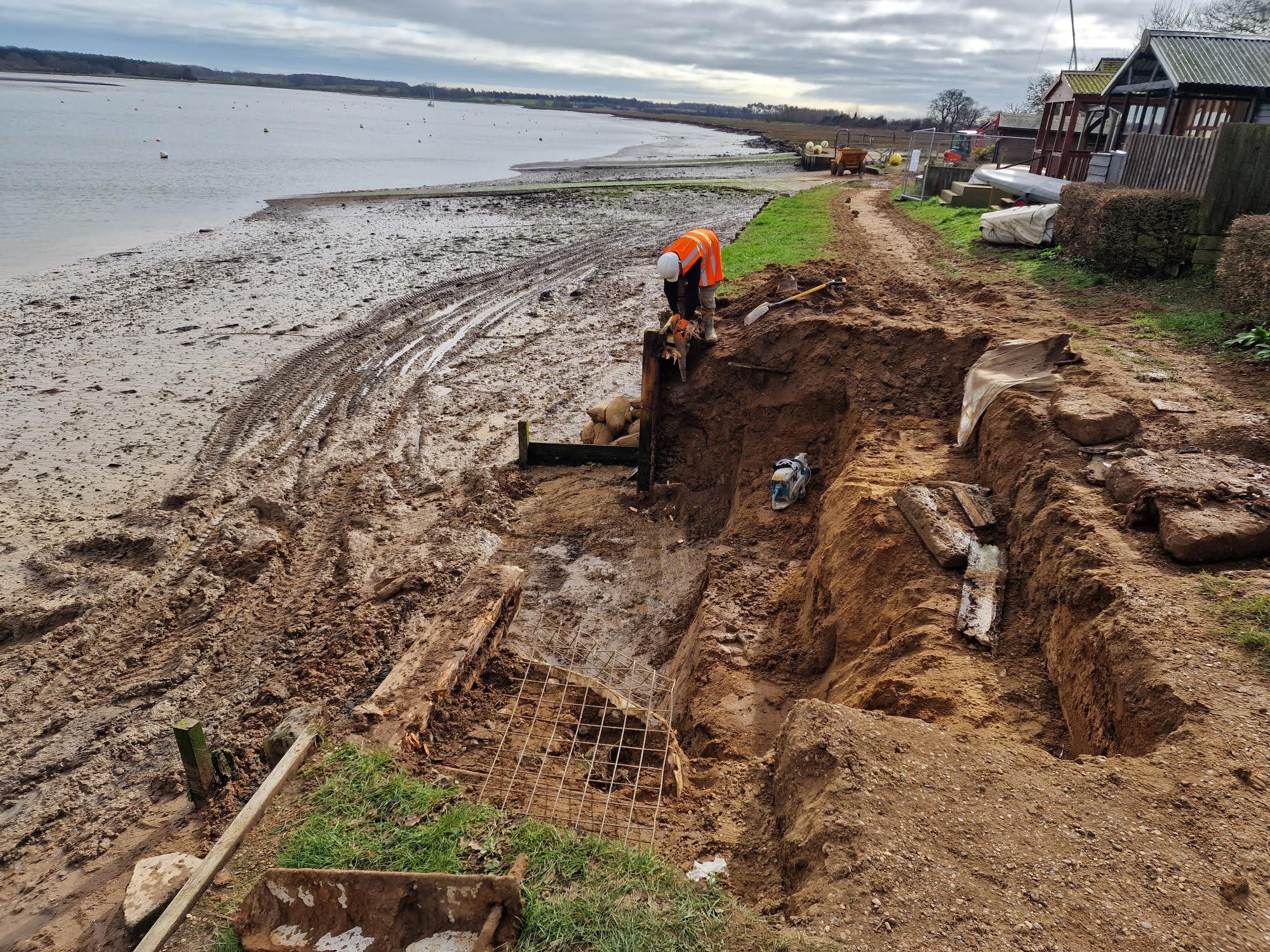 Towards the end of 2025, all of these factors came together to cause a small section of the wall to start failing. As a consequence, Waldringfield Sailing Club, as the riparian owner, arranged to have this section repaired in the last week of February by a construction company from Bury called Hazleton Construction, who they have used before for similar work.