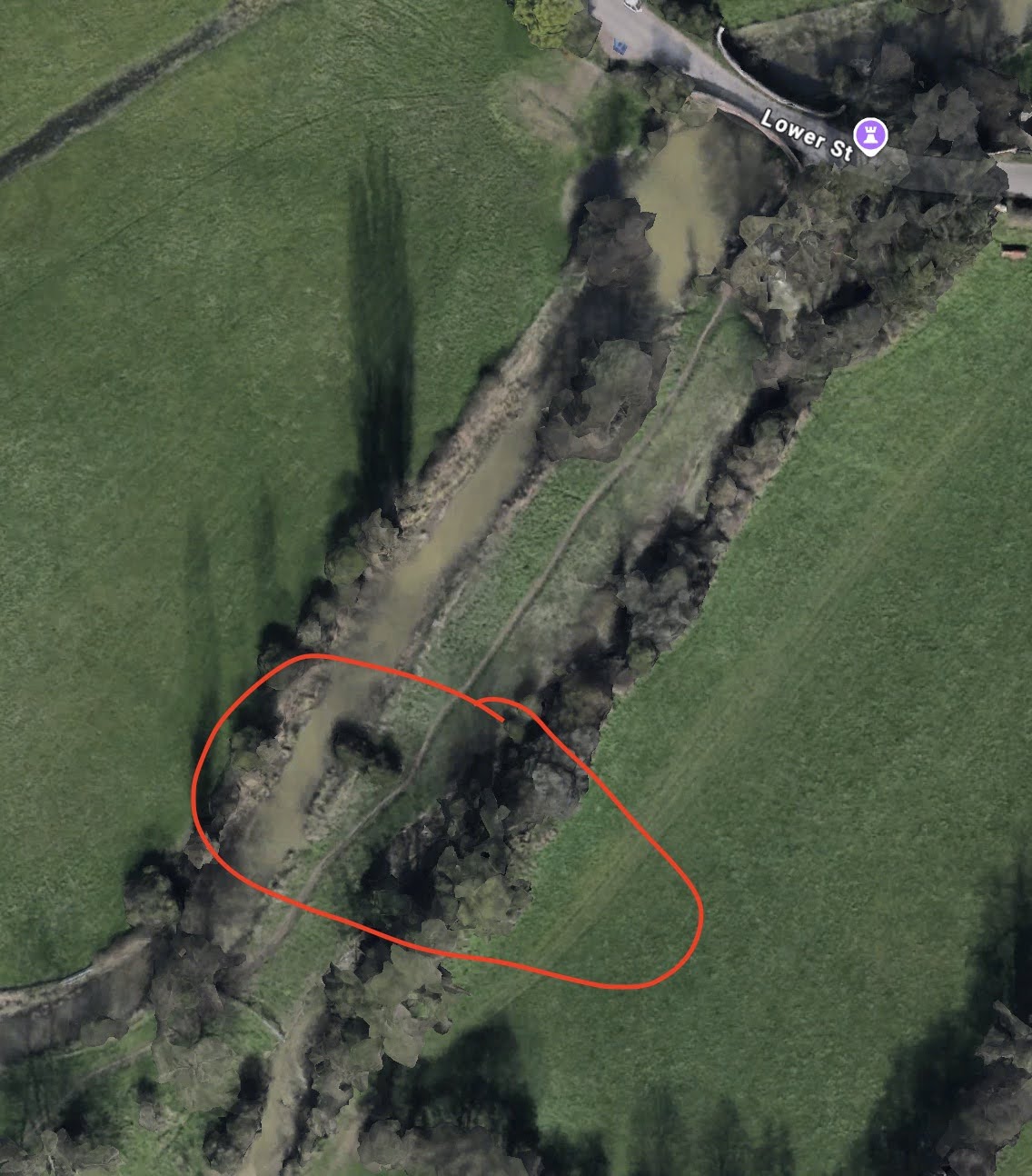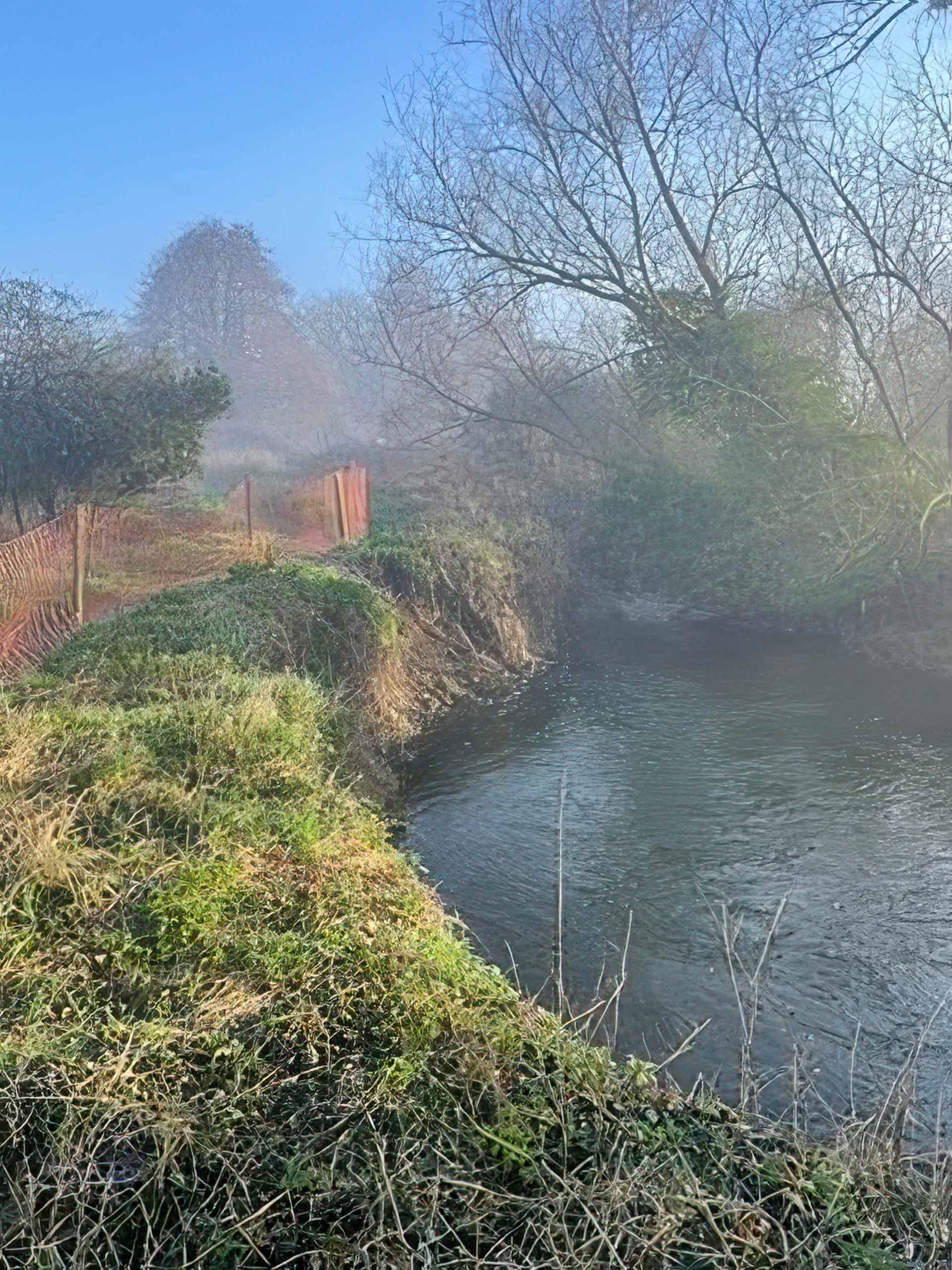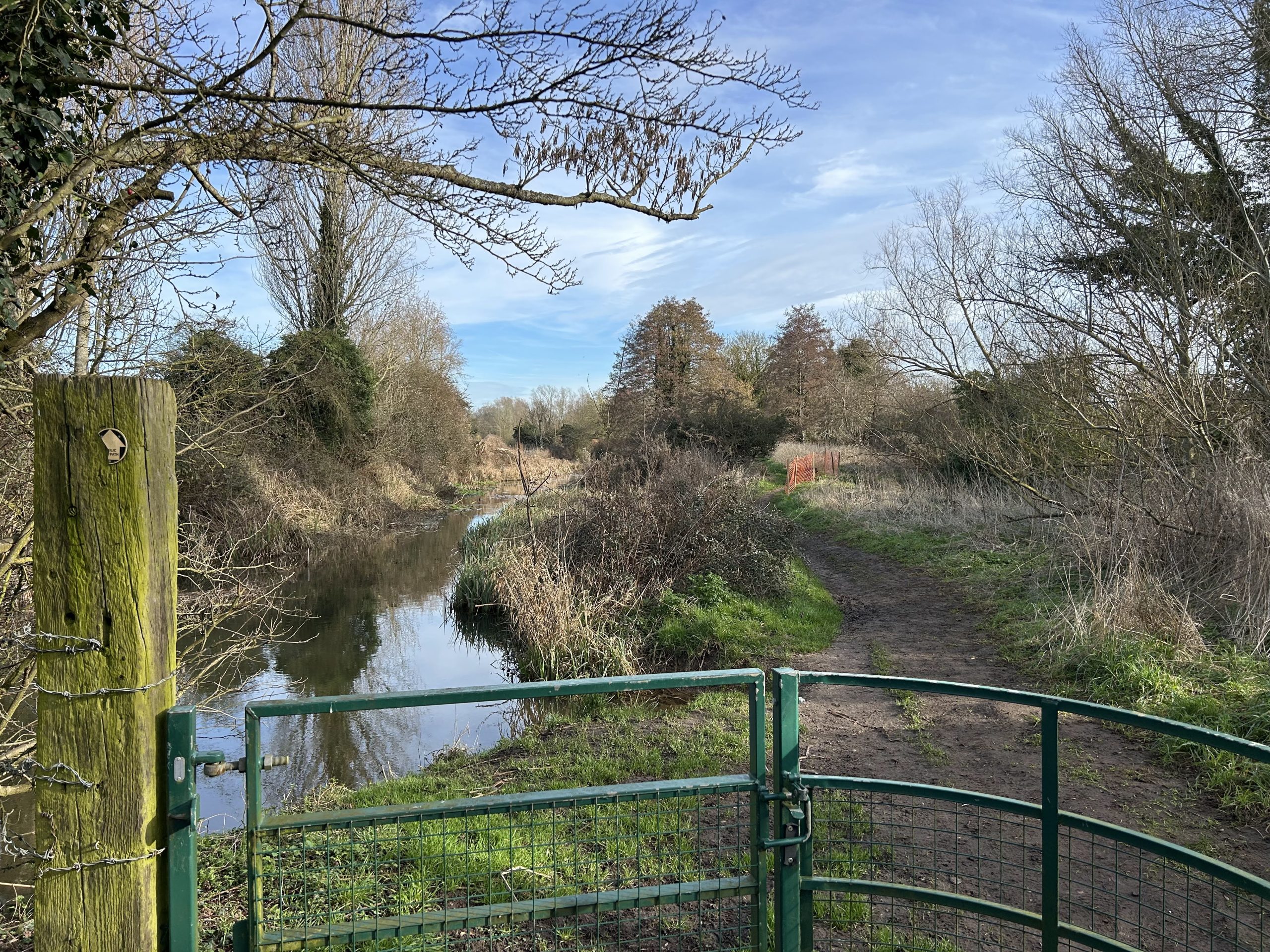 Half of the width between the two water courses has been lost in the past three years due to pressure caused by heavy rainfall, resultant water flow and flooding. Without attention this summer, it is likely to collapse during the next winter flooding season. The Environment Agency and Suffolk County Council are aware of the issue and the latter has erected temporary fencing to allow the footpath to remain open for now.