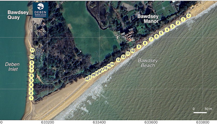 The Bawdsey Beach Monitoring Group are a voluntary citizen science initiative based on the Bawdsey peninsula and they have been measuring beach levels at Bawdsey Beach (in the region of the iron sheet piling) since 2013. Their measuring is usually undertaken on a weekly basis, and at 17 different survey points along the Bawdsey Beach frontage. In 2016, the monitoring was extended to include 11 sites along the Deben inlet margin in the direction of Bawdsey Quay.
